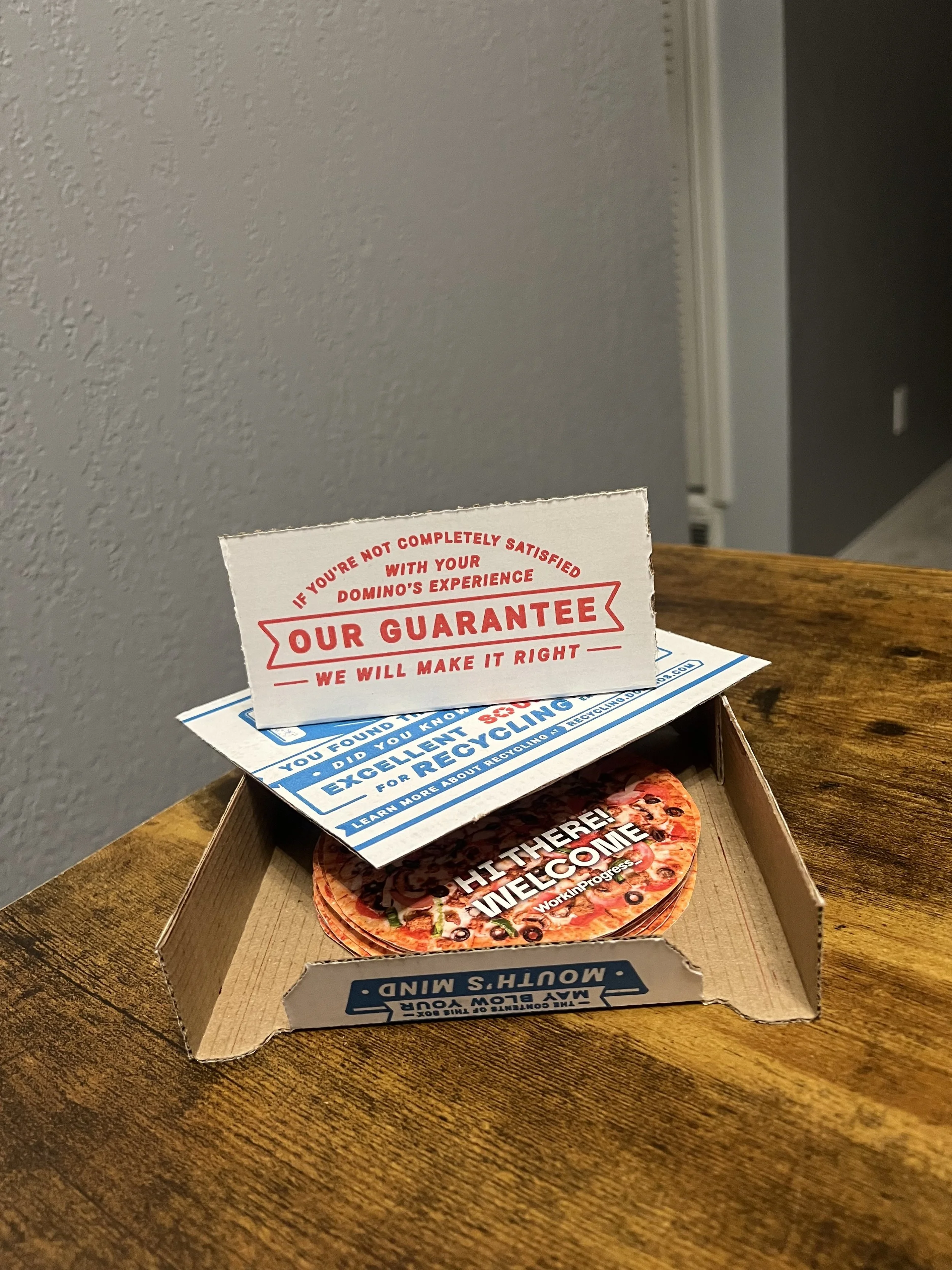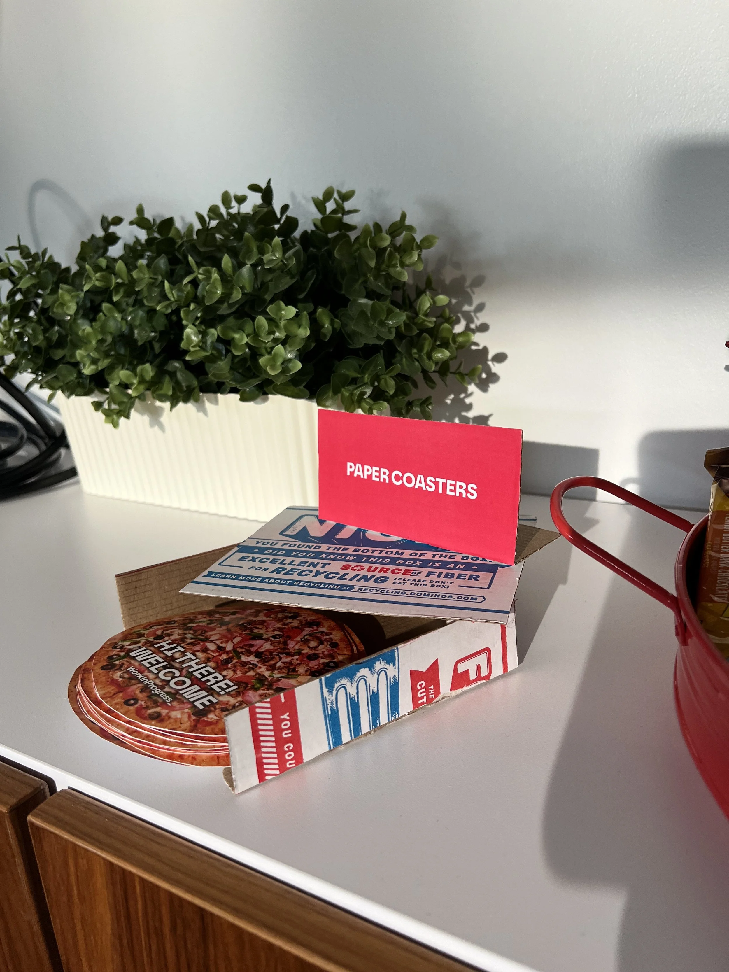 After choosing the final pizza slice design, I implemented the agency's branding. I then printed the design on water-resistant paper, glued them to a thin cardboard base, and carefully cut each coaster out. To complete the presentation, I crafted a small pizza box for them using a real Domino's pizza box.